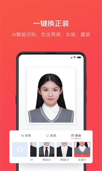 2、新增证件照一键换装功能,可实现3秒自由换装,包括女装、男装、童装。再也不用担心穿着不正式。