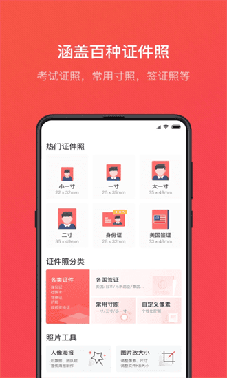 1、证件照分类:查看全部证件照的分类信息并选择类型修改尺寸;