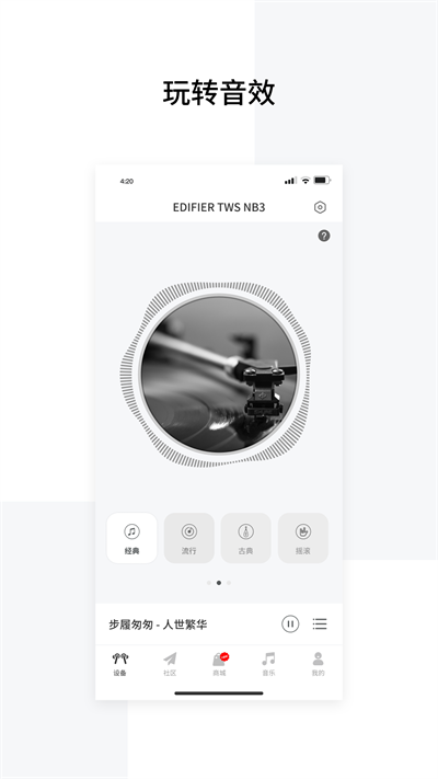 漫步者系列蓝牙耳机配套APP,通过丰富的人机界面,向您展示更多产品中的隐含功能,进一步提升产品的价值和可玩性。针对部分产品更提供了固件升级选项,让您的产品随时能摇身一变,升级换代。