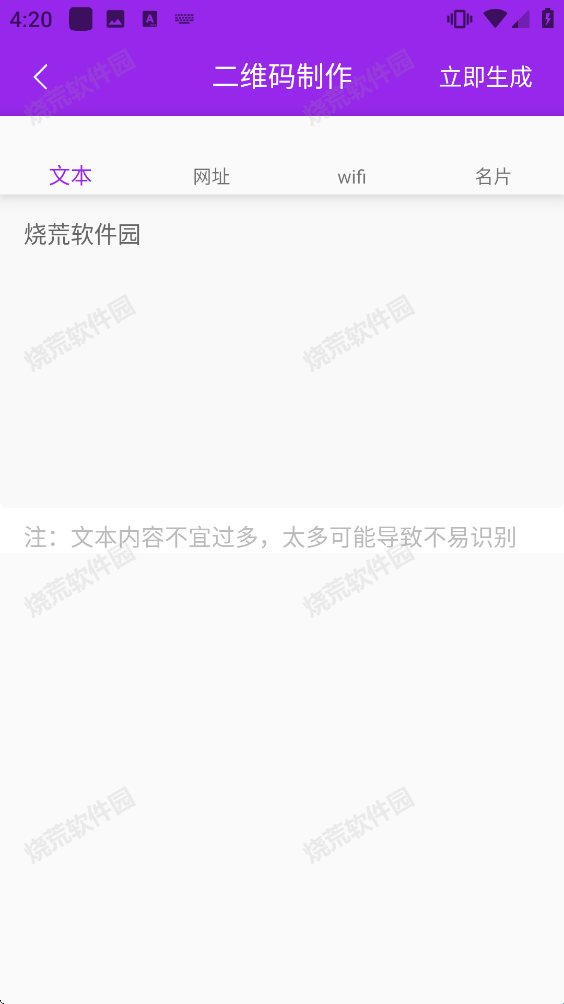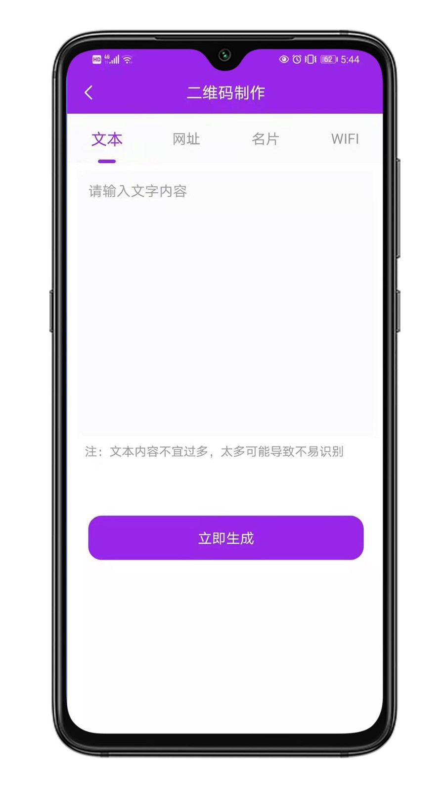 1、输入内容:选择所需二维码类型,输入相应文本、网址、名片或WiFi信息。