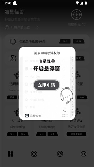 2、首次使用需授予悬浮窗权限,确保准星正常显示。