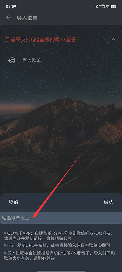 温馨提示:目前速悦音乐仅支持导入来自QQ音乐的歌单内容。