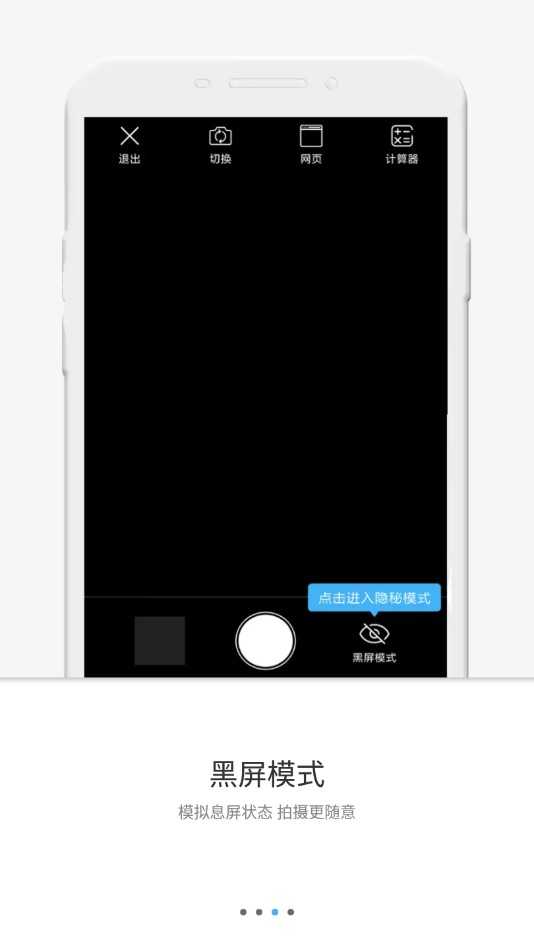 1:【黑屏模式】点击拍照界面的小眼睛,手机屏幕就会漆黑一片,并且点击屏幕也无任何反应,真正做到的防误触机制。酒吧、夜店、KTV从此再也不怕失手了,也可在遇到不发骚扰时偷偷录制证据,强力维权。