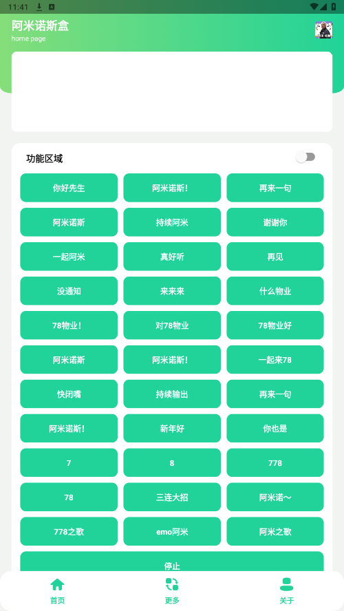《阿米诺斯盒》是一款充满趣味与惊喜的音效语音软件。汇聚了众多阿米诺斯特色语音,只需轻轻一点,即可释放出各种独特音效,为你的聊天增添无限乐趣。无论是朋友间的日常调侃,还是网络社交平台上的互动,阿米诺斯盒都能为你带来意想不到的惊喜效果,让你的声音充满个性与创意。