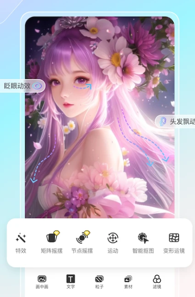 【动态特效加持】 内置眨眼、水流、粒子光效等丰富动画效果,一键为静态图片注入生命力,打造会动”的壁纸与海报。