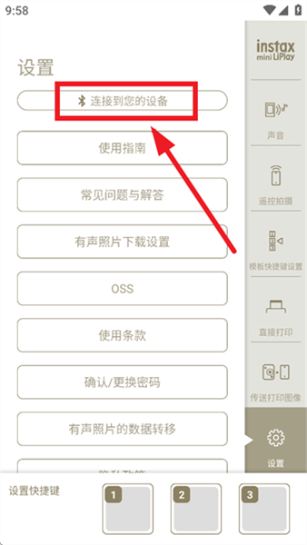 3. 在应用内进入设置,点击连接到设备”,系统将自动搜索附近的相机。