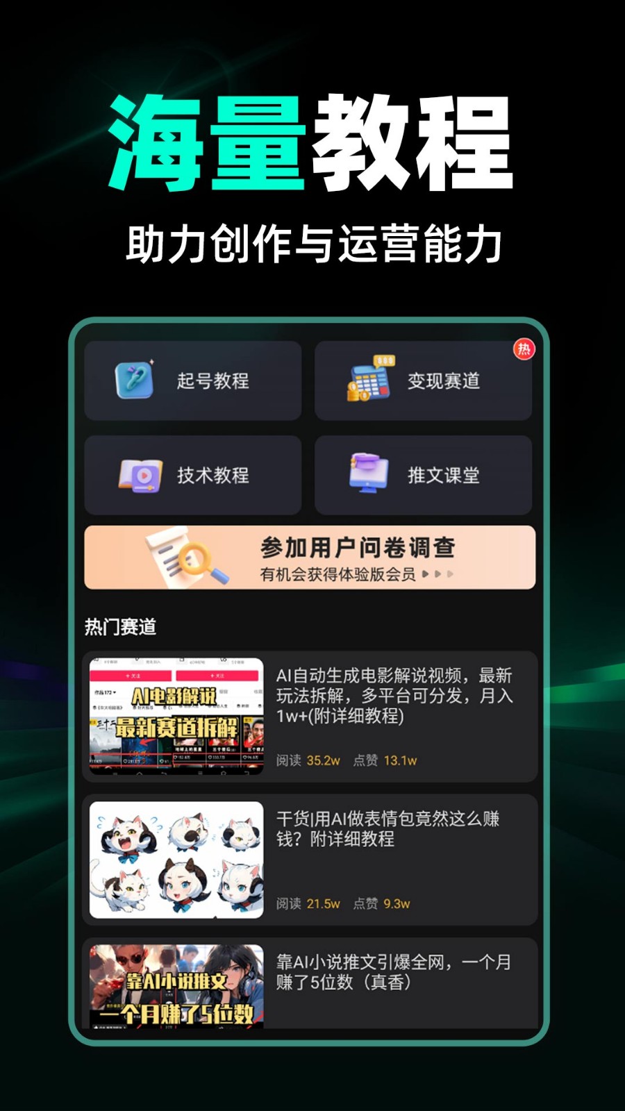 3、提供从零开始的保姆式教学,涵盖起号、授权、变现全流程,包含起号教程、变现赛道、技术教程、推文课堂等内容,支持通过答疑群免费学习,专业团队在线指导。