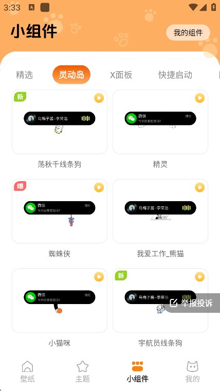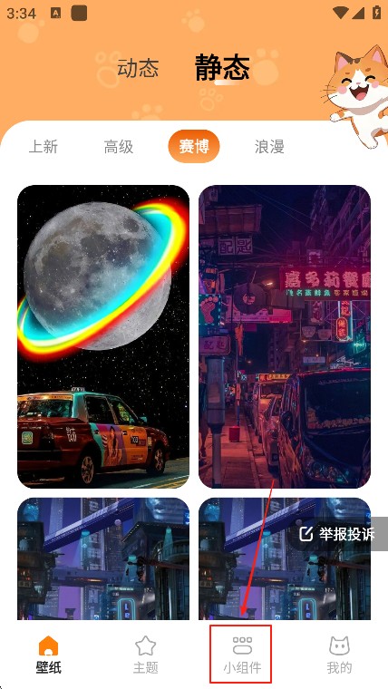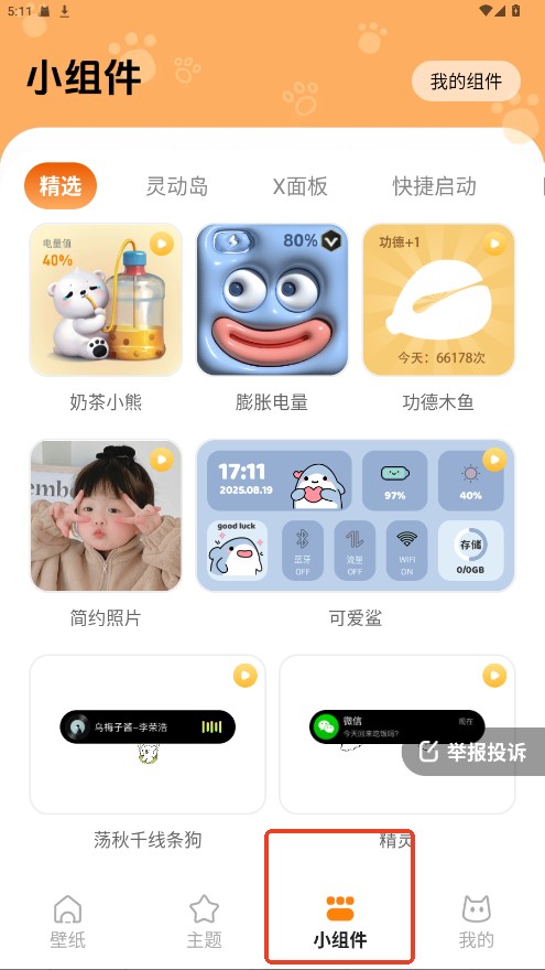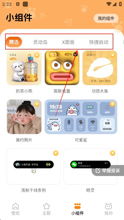 打开西西壁纸主题App,点击底部导航栏中的小组件”选项,进入组件中心。