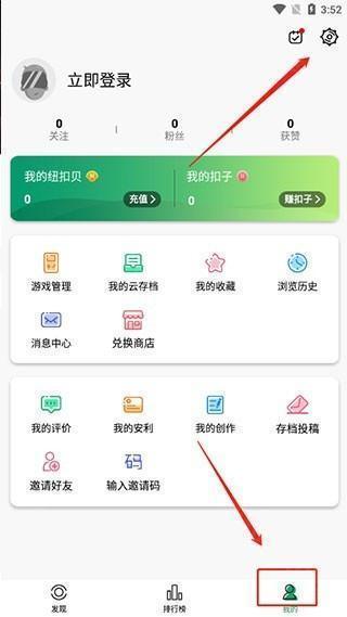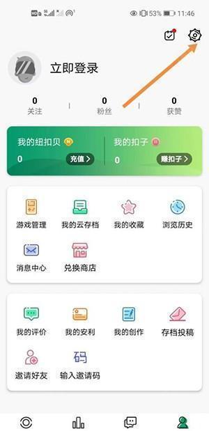 1、进入纽扣助手老版本,切换至【我的】界面,点击右上角齿轮状【设置】按钮。