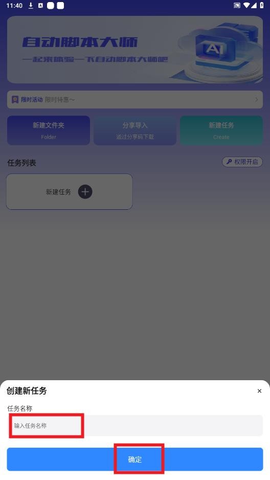权限配置完成后,输入任务名称并确认,即可开始录制或编辑您的专属脚本。