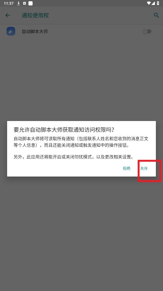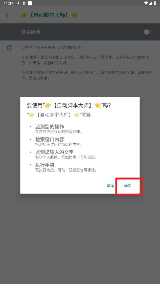 在无障碍服务列表中找到自动脚本大师”,并开启该服务以确保脚本正常运行。