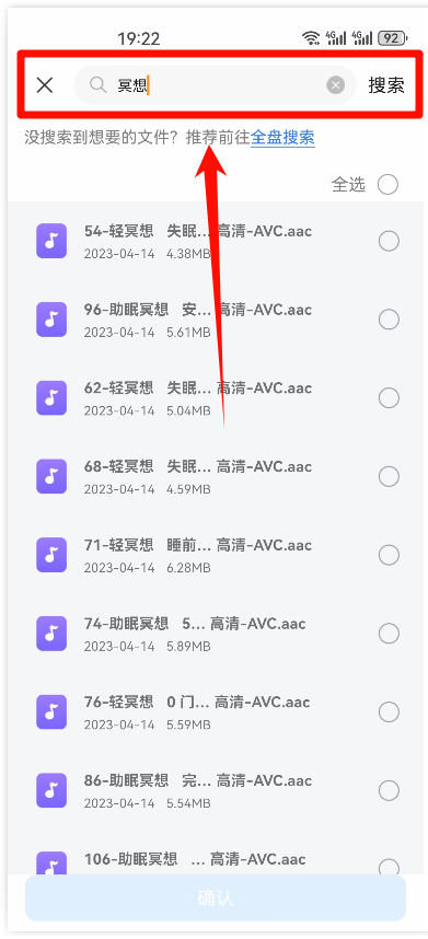 步骤3:在搜索框中输入音频文件的关键词,点击搜索。