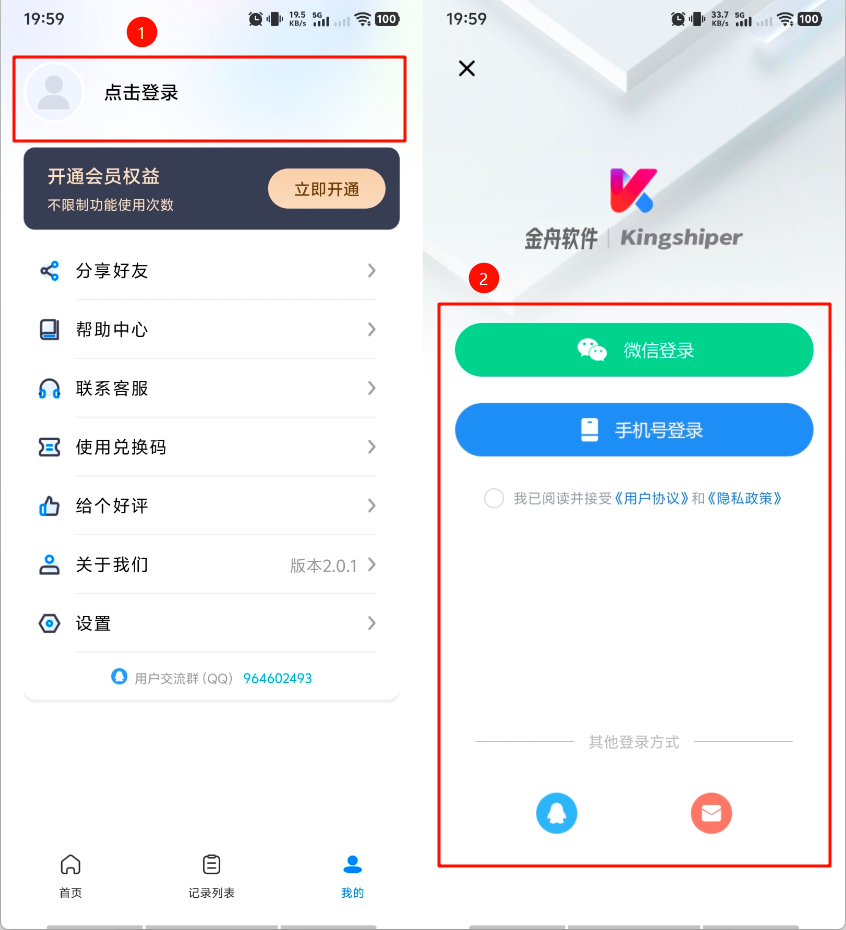 2、打开金舟ZIP解压缩APP,找到我的”,点击点击登录”,按自身情况选择登录方式。