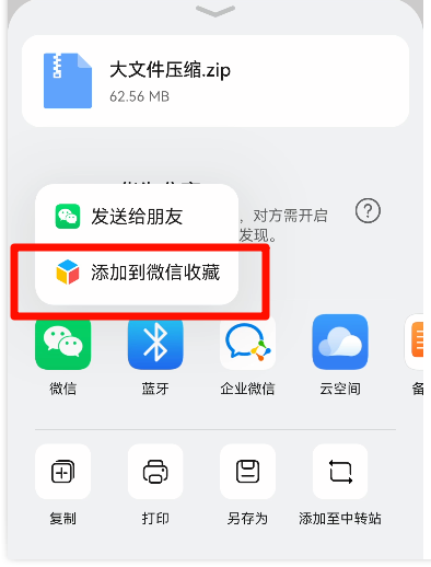 受官方限制,手机文件直接分享到具有一定大小限制,超过文件限制大小,无法直接分享,您可先分享到收藏之后,再通过收藏将文件转发分享到。