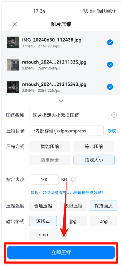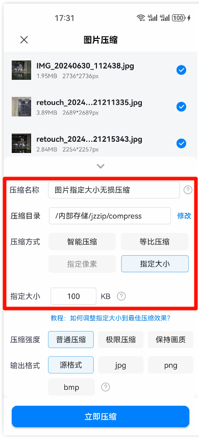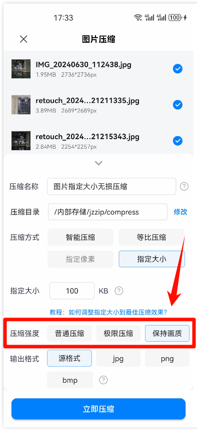 第五步、最后确定自己想要图片输出的格式后,点击【立即压缩】完成图片的指定大小压缩。