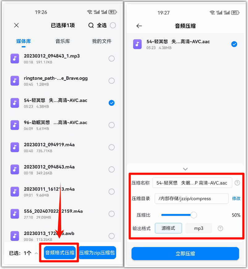 步骤6:选择音频格式压缩,设置名称、目录、压缩比、输出格式等,完成音频压缩即可。
