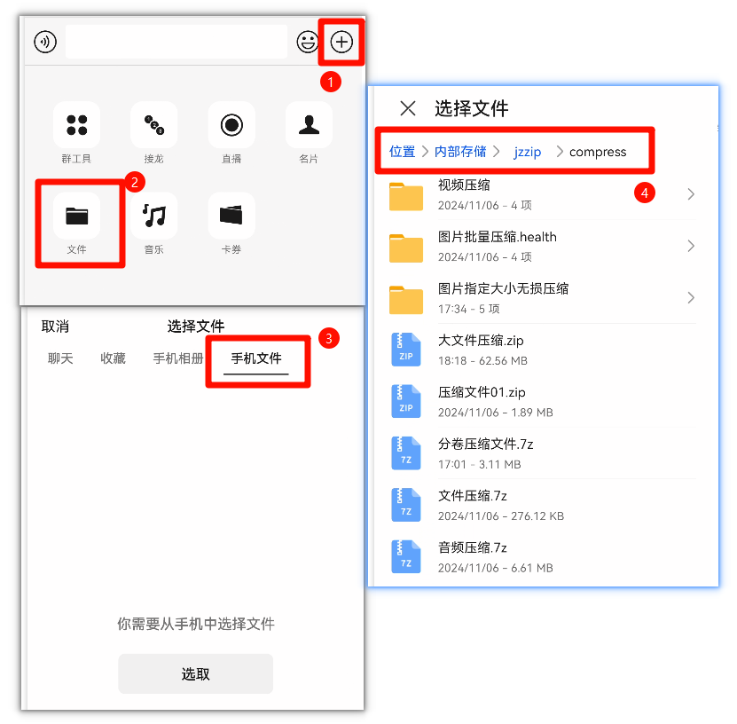 手机打开对话框,点击+➩”文件”➩手机文件”➩位置”➩内部存储”➩jzzip”,进入压缩文件路径,选择想要传送的文件。