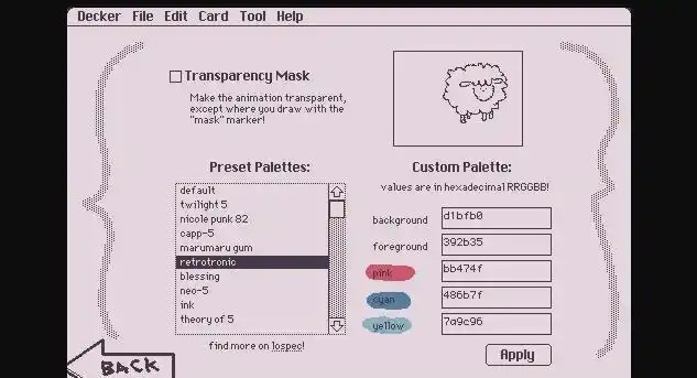 颜色是绘画的灵魂,Wigglypaint 为此打造了高度自由的调色体系。用户可随时切换基础色,也可通过Options”进入高级调色界面,使用预设调色板或自定义RGB值精确调配理想色彩。右侧Custom Palette”区域支持手动输入RGB参数,实现像素级颜色微调,确保每一处细节都符合你的艺术构想。