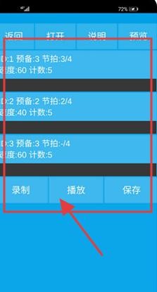 操作界面简洁直观,主屏即显示预备1”预备2”等预设选项,用户可快速设定速度(BPM)、拍号、重音位置及小节数。集成录制、播放与保存按钮,支持即时捕捉练习片段,方便回放复盘与进度追踪。