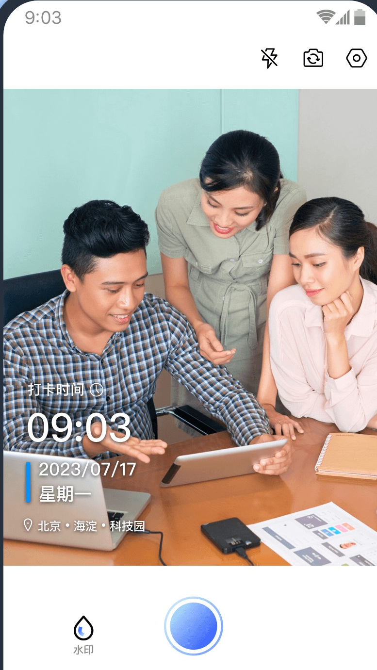 打开真实时间水印打卡相机App,点击首页水印相机”或直接进入拍摄界面,快速启动记录流程。