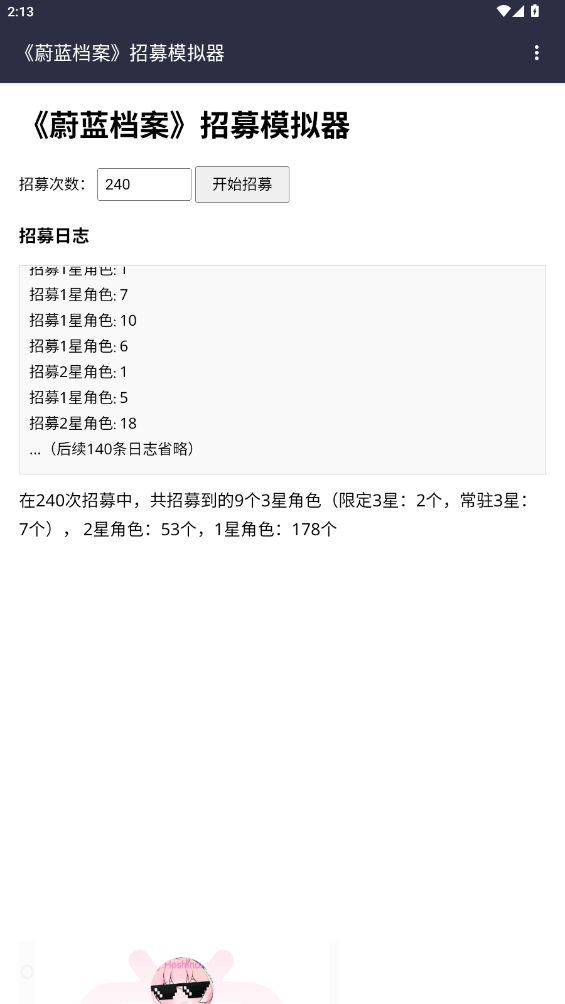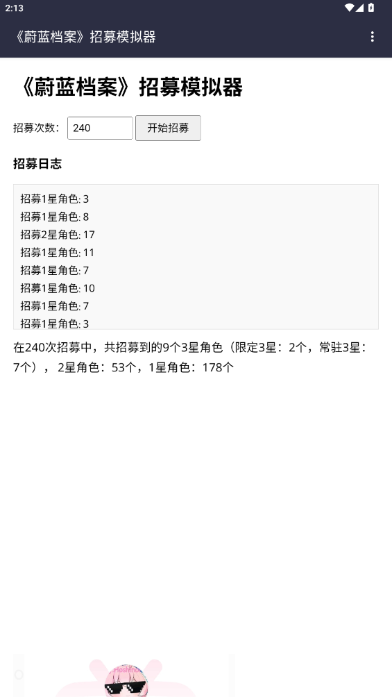 打开《蔚蓝档案招募模拟器》,首页即提供简洁明了的操作入口。只需输入基础参数(如选择卡池类型),点击开始招募”,即可立即进入模拟抽卡流程。整个过程无需注册登录,零门槛快速启动,特别适合利用碎片时间进行策略演练。