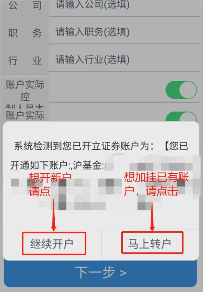 6. 选择开户”或转户”:新开账户请选择继续开户”,已有账户加挂请选择马上转户”