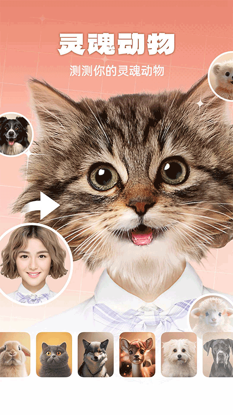 灵魂宠物是一款集AI美颜、3D虚拟形象生成与趣味养成于一体的创意相机App。它能智能识别你的面部特征,通过先进的3D建模技术,为你量身定制”一只与你神似又充满个性的灵魂宠物头像。无论是自拍还是上传照片,只需几步,即可解锁属于你的专属动物化身。除此之外,App还融合了时光穿梭特效、卡通滤镜、虚拟宠物互动等多元玩法,让你在记录美照的同时,收获一份趣味十足的数字陪伴体验。