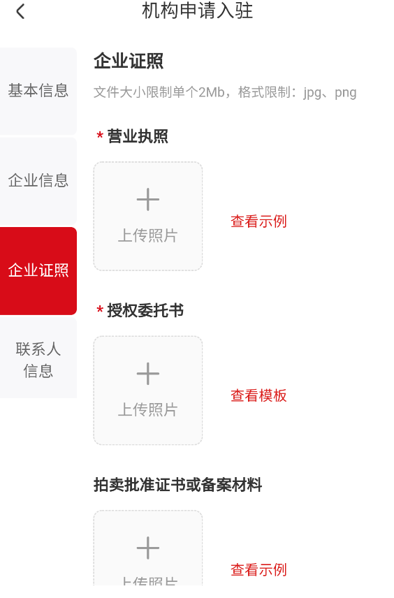 4、继续上传企业的营业执照、授权委托书、拍卖批准书。