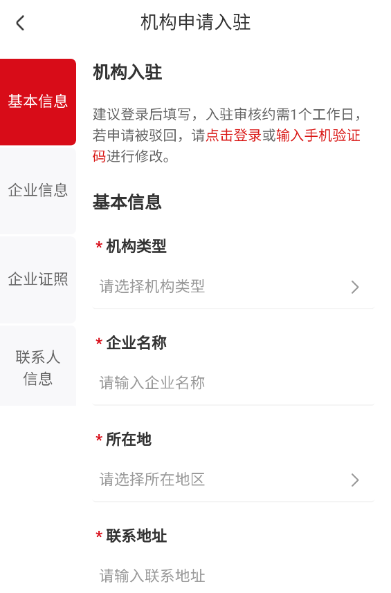 2、首先填写基本信息,详细输入机构的类型、企业名称、所在地、联系地址等。