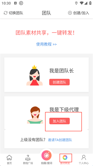 2、进入首页,点击最下方 【素材转发】,点击中间【加入团队】