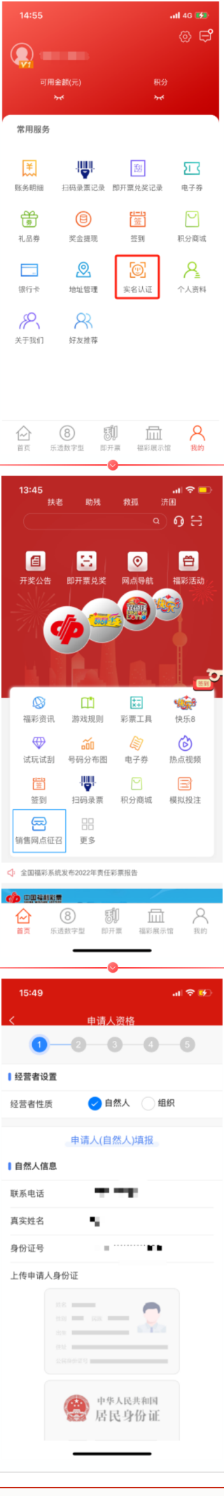 • 实名认证:为使用全部功能(包括兑奖、开店申请等),必须完成实名认证;