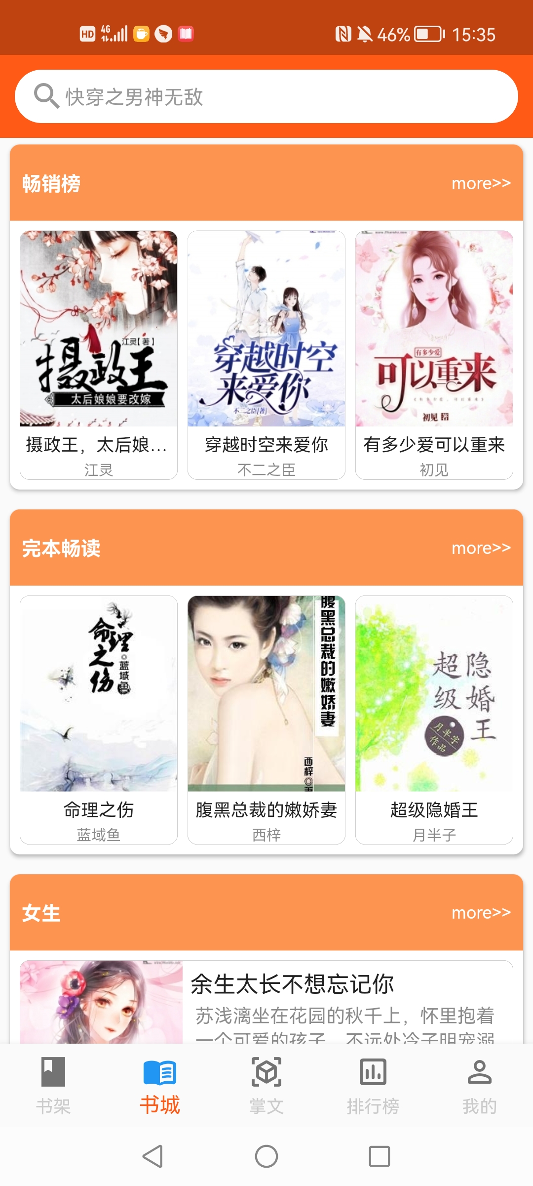 3、丰富的书城划分专区,这里设置了上新、男生、女生以及完本等专区;