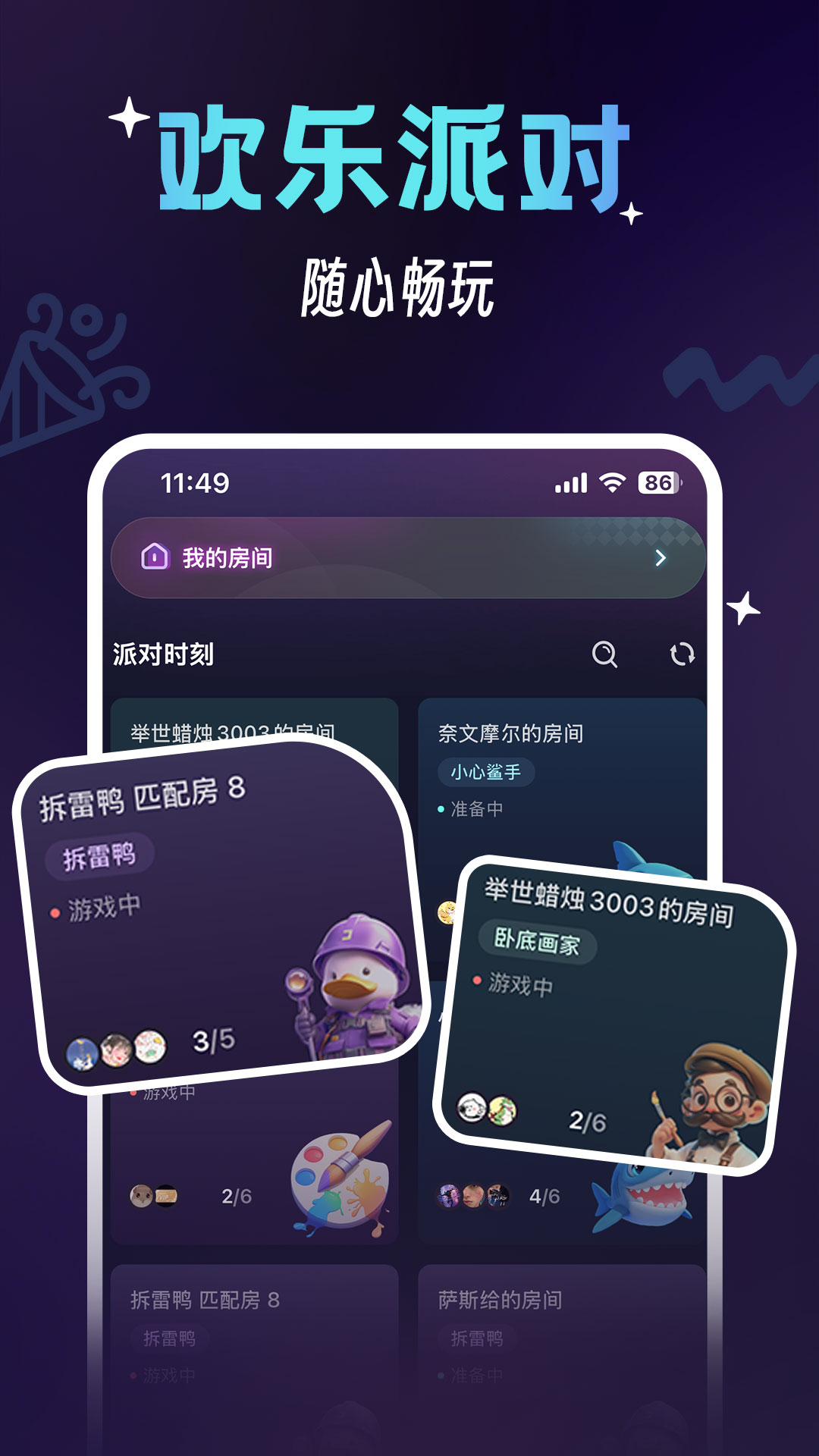 好友组局: 为了让玩家们能够更方便地与朋友一起玩游戏,咪特游推出了好友组局功能。只需轻轻一点,即可快速邀请好友加入房间,开始一场精彩的对决。此外,该功能还支持创建专属房间,设置密码保护,确保隐私安全。