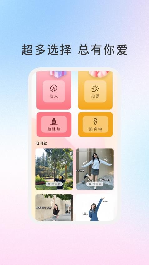 1、打开软件可以选择拍人、拍景、拍食物、建筑等不同的模式。