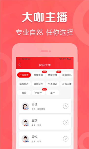 叫卖广告录音制作是合肥培音信息科技有限公司开发的一款广告录音配音工具的生活服务类软件。在软件中用户只需输入文字便可以转成语音,智能转化为语音。软件内为用户提供多种声线,用户可以自由选择。适用于地摊叫卖、打折促销、厂家直销等场景。此外,软件内还有海量背景音乐和配音文本模版,用户都可自由使用。