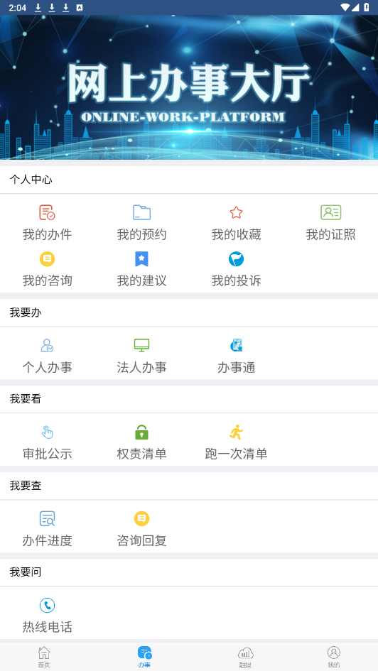 ——预约办事、立即办理—个人/法人、我的预约、我的咨询、我的投诉、咨询回复。