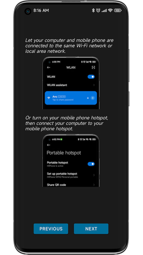 2、如图,需要手机与电脑保持在同一网络下。可以是手机分享热点给电脑连接网络;也可以是让电脑网络连接到局域网内的路由器以达到连接效果