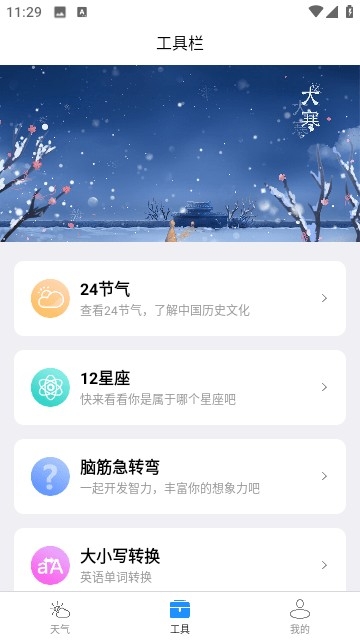 开言天气是一款功能强大的气象预报软件。软件拥有全国各个地区的天气实时预报,按分钟更新,主界面温度、天气、紫外线等数据清晰显示。支持未来15天的精准预报功能,便于用户做出行准备。此外还有24节气、12星座、脑筋急转弯、大小写转换等功能,感兴趣的朋友们赶紧下载体验吧。