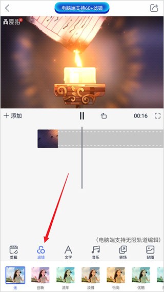 6. 点击【滤镜】,为视频添加风格化视觉效果,如胶片、日系、唯美等。