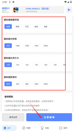 3、根据个人喜好设定画面风格、帧率、分辨率及屏幕比例等选项,点击立即解锁即可生效