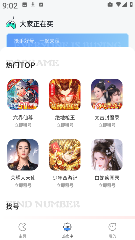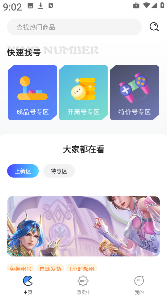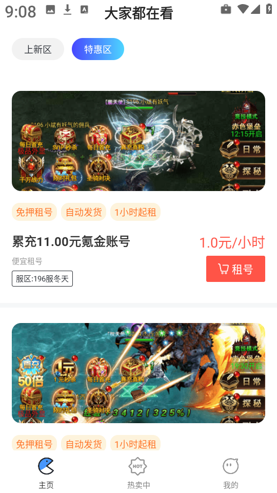 3、点击底部导航栏中的热卖中”,快速浏览当前热销游戏账号。