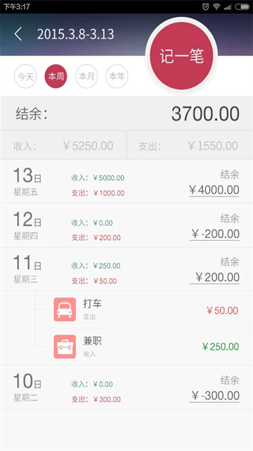 3、自动显示结余金额,每天的收入以及支出情况都能了如指掌;