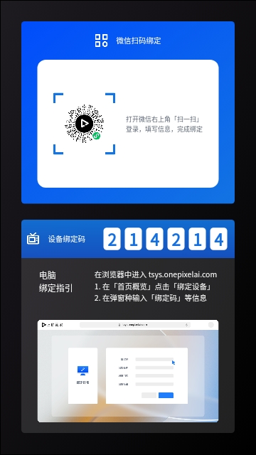 4、也可以绑定电脑,在浏览器中进入tsys.onepixelai.com,在「首页概览」点击「绑定设备」,在弹窗种输入「绑定码」等信息
