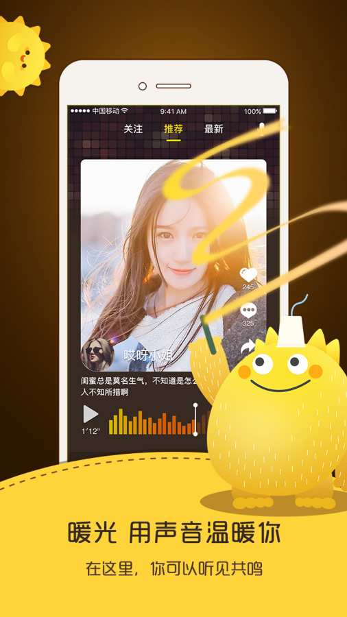 暖光是一款主打声音交友的app。在暖光app里,所有的人都可以是你聊天的对象,在这里不需要你露脸,颜值不重要,一切都以语音为主。来暖光app你可以找一个人倾诉你的心声,收获暖心陪伴。有兴趣的小伙伴们赶快下载下来吧!