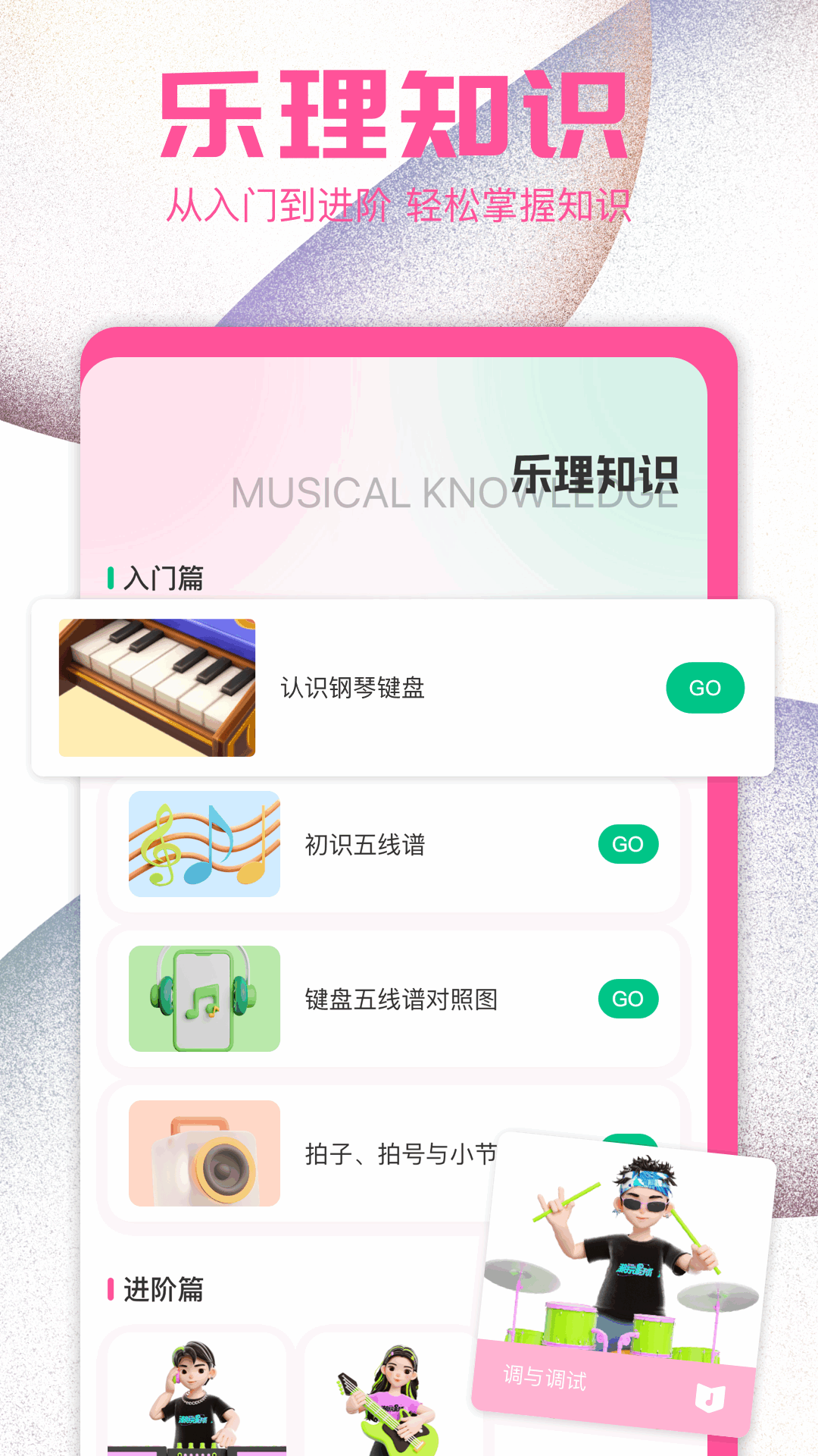 4. 乐理知识:提供多种形式的乐理学习资源,帮助用户学习音乐理论,掌握音乐创作的基础。