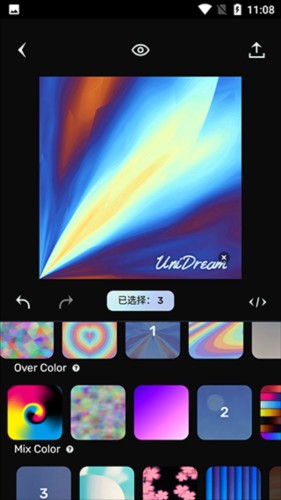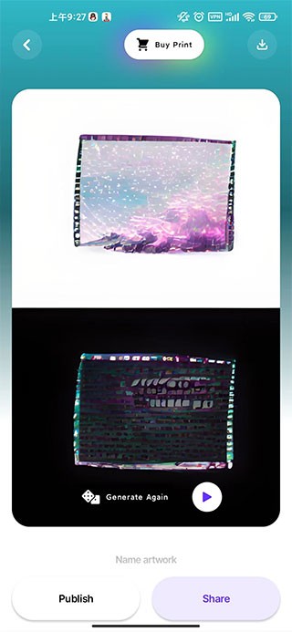 打开Dream梦境生成器后,首页提供两大核心模式:AI生成艺术作品或AI生成梦境幻象。你可以根据创作目标自由切换。以艺术创作为例,先从动态粒子效果与色彩搭配中挑选组合,系统会实时渲染出独特画作。支持叠加多种艺术滤镜,点击图片上方的小眼睛图标即可预览最终效果,满意后一键保存或分享至社交平台。
