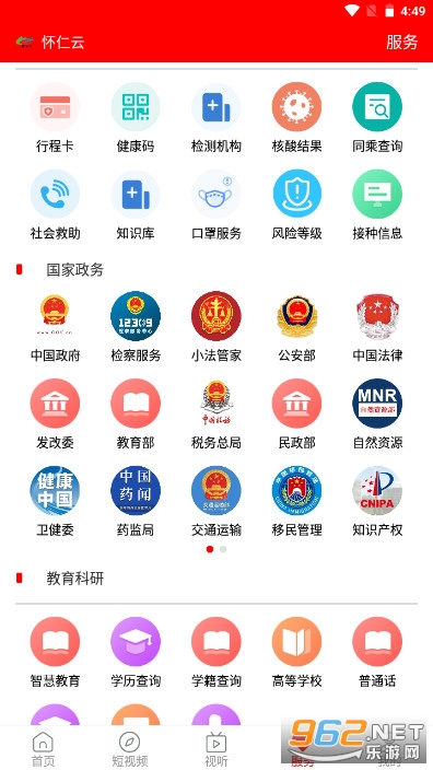 5、切换到服务中心查看服务划分,点击行程卡图标能打开查看自己的行程记录