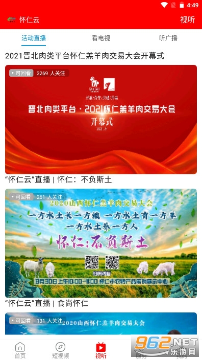 4、进入到视听页面查看栏目,选择活动直播栏并选择某直播点击回放