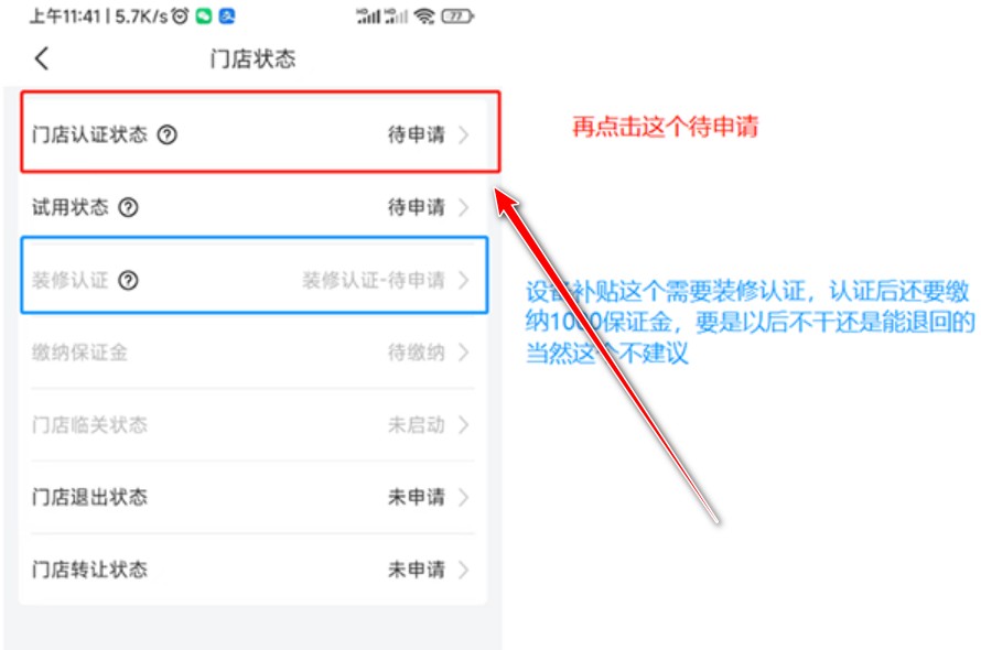 6、进入App,点击右下角【我的】,找到【门店状态】后的待申请”按钮。