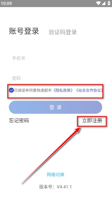 1、打开兔喜生活用户版,勾选已阅读并同意快递超市《隐私政策》《站点合作协议》,点击立即注册。